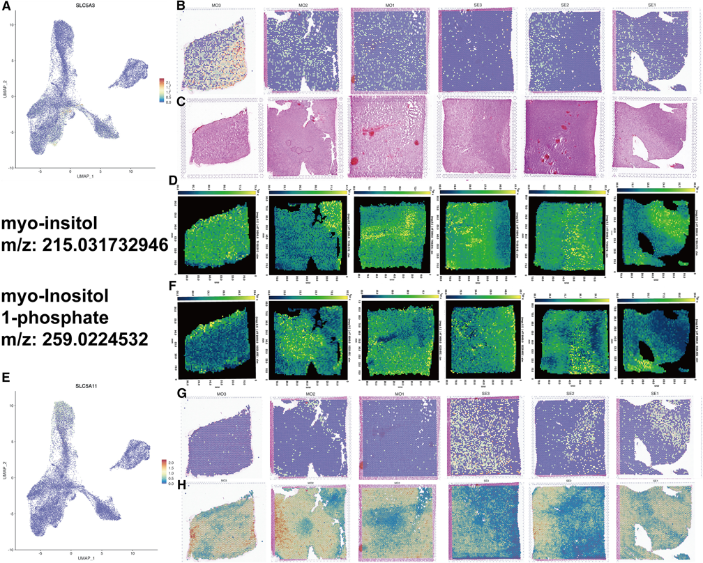 4.2 肌醇(MI)增加与脑损伤密切相关,因此进一步研究了肌醇MI的分布,发现MI和MI 1-磷酸的补体表达,MI区域表达越高,MI 1-磷酸的分布越低,反之亦然(图5D和5F)。由于MI的分布与ST集群1和8非常一致,在集群1和8中发现的最前面的基因中,发现SLC5A3(也称为钠/MI交换转运蛋白1)在中度TBI组中高表达(图5A-5C), SLC5A11(也称为钠/MI交换转运蛋白2)在重度TBI组中高表达(图5E, 5G和5H),这与MI和MI 1的磷酸盐分布一致。